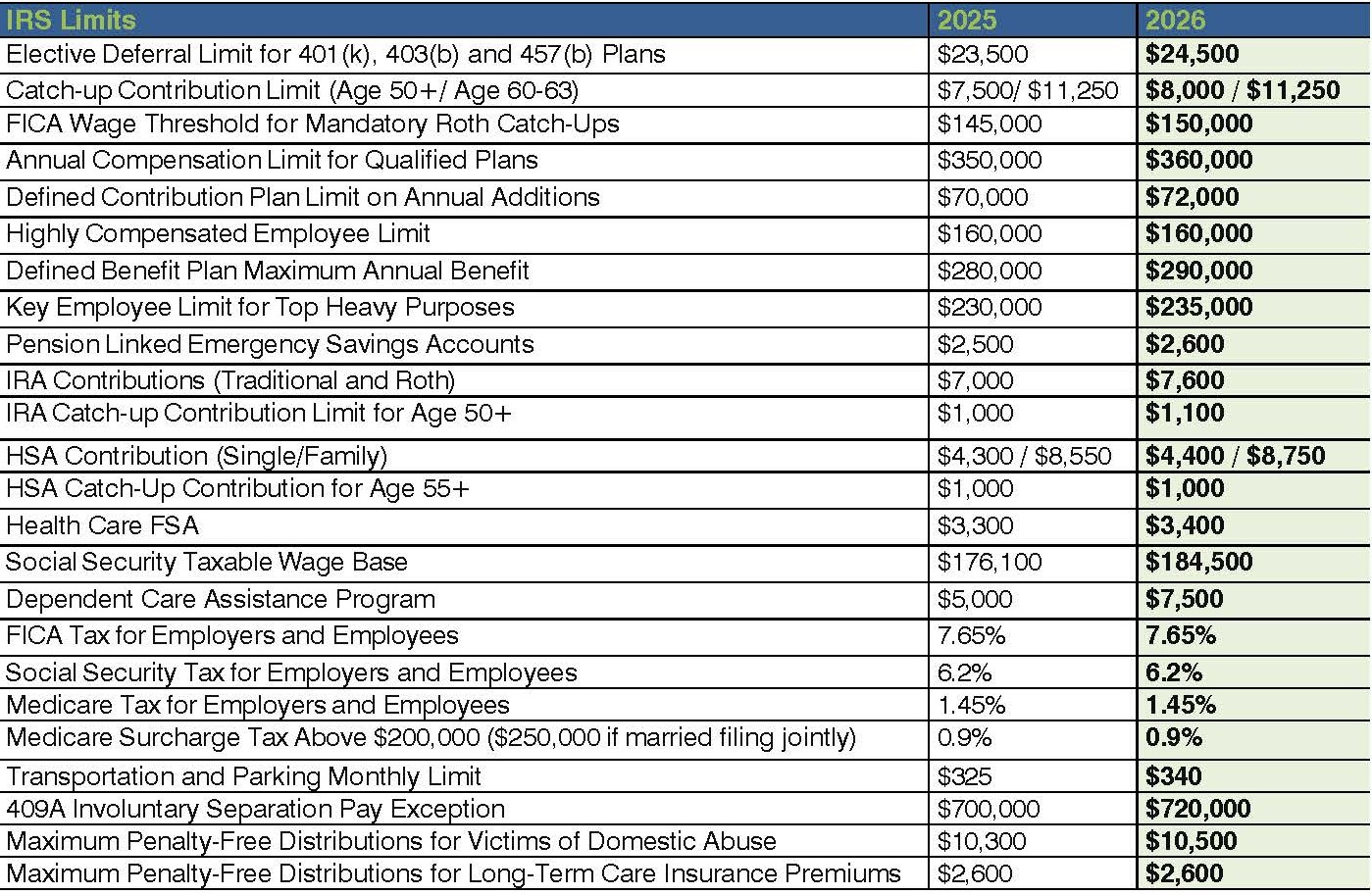 The IRS released the 2026 contribution and plan limits for retirement plans including 401(k), 403(b) and IRAs and HSAs – and most of the key thresholds are moving up. Higher caps mean greater opportunities for employees to optimize their savings. The increases reflect a 2.8% cost of living increase (COLA) under the Consumer Price Index for All Urban Consumers, up from 2.5% in 2025.