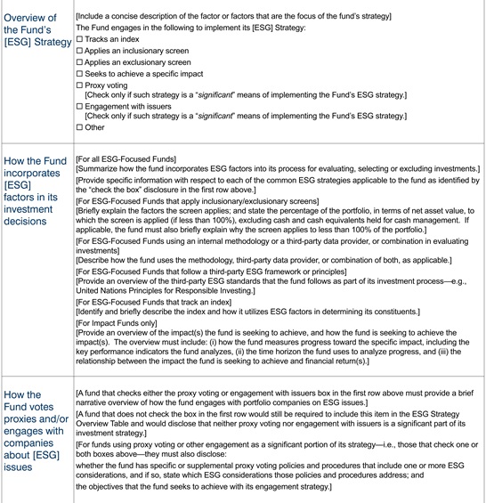 Required ESG Strategy Overview Table in Prospectus. ESG-Focused Funds, including Impact Funds, would provide key information about their consideration of ESG factors in a tabular format—an ESG Strategy Overview table—in the fund’s prospectus.